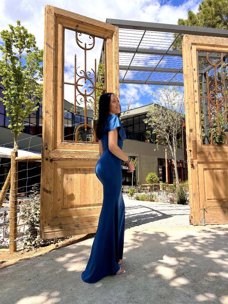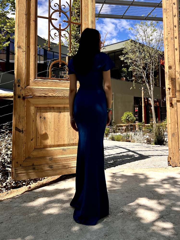 Aurora es un vestido largo con un tejido elástico fuerte y con refuerzo en la cintura tipo corset.