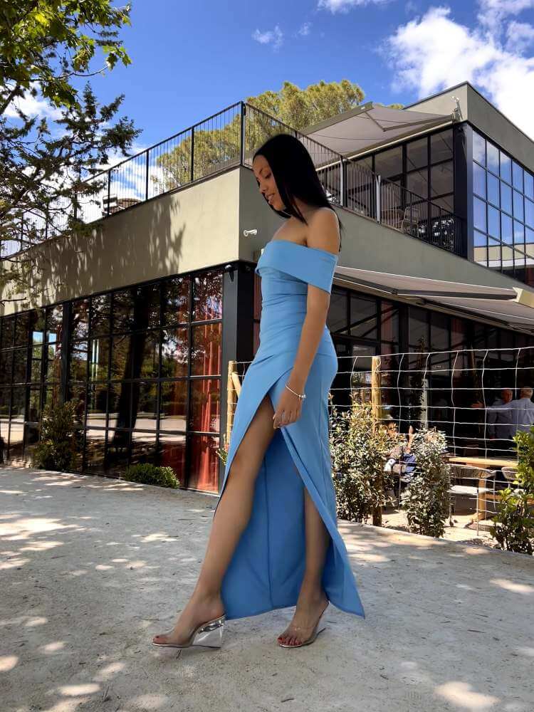Vestido largo de tejido elástico con escote bardot y banda dejando hombros descubiertos. Cuerpo ajustado con falda larga y abertura lateral, es ideal para eventos, bodas y graduaciones.